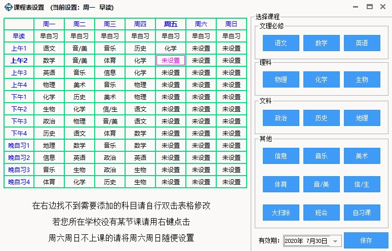 3、课表的日期和节数可以自定义,基本能够满足各个中小学的课程安排;