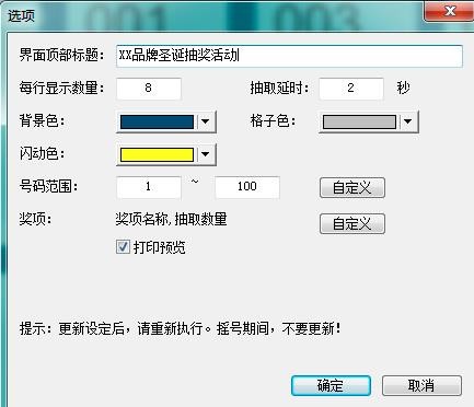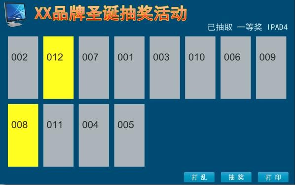 按钮“打乱”-》“抽奖”,所有奖项抽取后。按钮“打印”输出抽奖结果