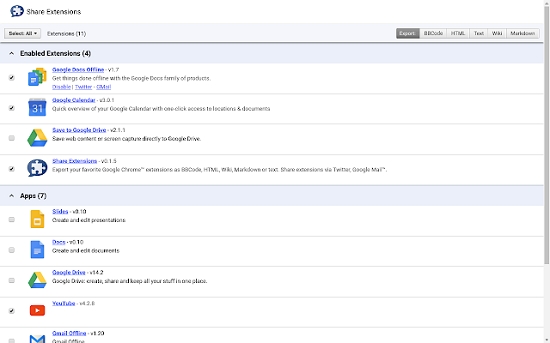 将您喜爱的 Google Chrome™ 扩展程序导出为 BBCode、HTML、Wiki、Markdown 或文本。通过 Twitter、Google Mail™ 分享扩展程序。