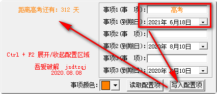 第1次运行时,3个事项均为空,可以按需要自行依次(比如不要只填1和3)填入事项内容、选择需要的日期,点击“写入配置项”。