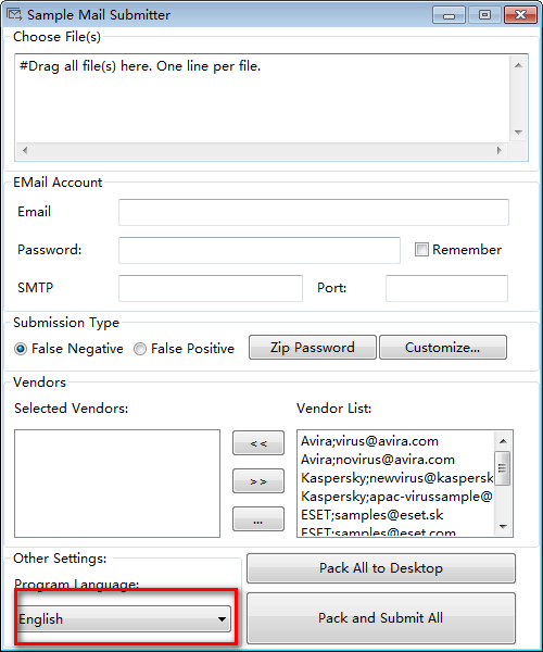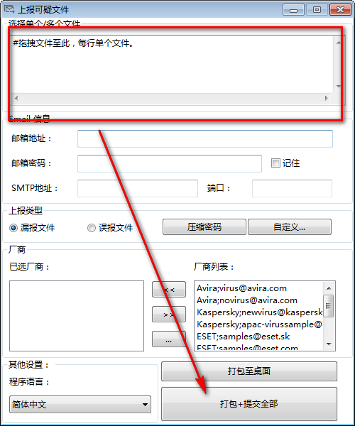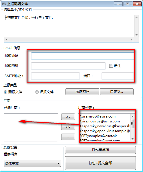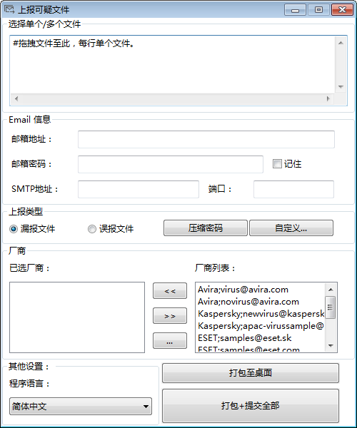 上报可疑文件(Sample Mail Submitter)是非常多的人都在使用人用的一款能够将有毒或者可疑的文件发送至各个反病毒厂商邮箱的软件,支持自定义反病毒厂商邮件列表,可选择同时发送至多个邮箱地址,接下来万能驱动网小编就给大家带来这款软件的具体介绍,感兴趣的小伙伴们速来看看吧~~