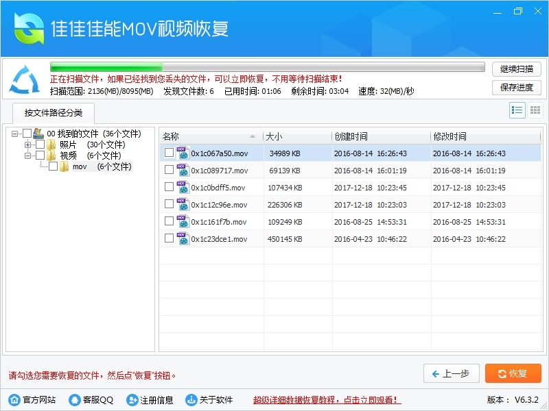 使用碎片重组技术,专业恢复各种微单、单反相机、摄像机拍摄的MOV格式的视频。