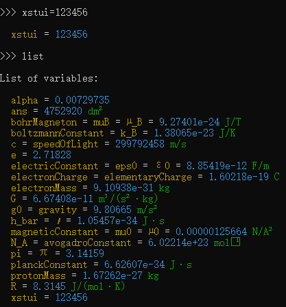 使用help指令查看帮助,list指令可以查看定义的常数及变量,包括我们自己的定义。