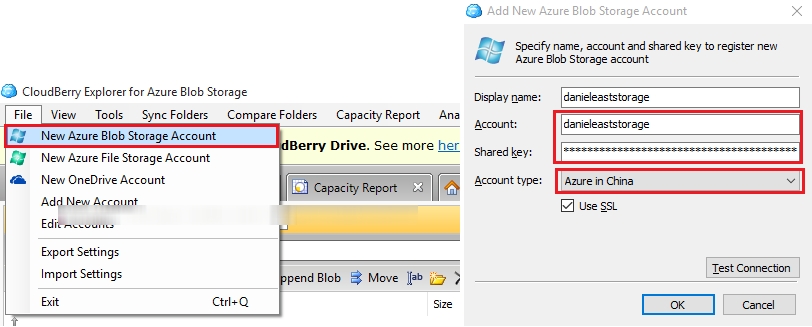 下载后简单安装后就可以开始使用,首先要完成账号的添加工作,填写Account和Shared key,同时指定Account type为“Azure in China”: