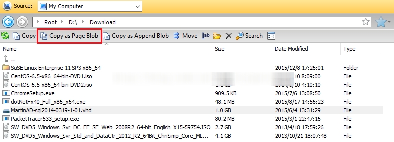需要注意的一点是,由于vhd创建磁盘使用的时候,要求为Page Blob类型,而默认在两边拖拽的话,会以Block Blob的形式进行传输,所以如果是vhd文件,请务必使用下边的“Copy as Page Blob”功能,而不要直接拖拽: