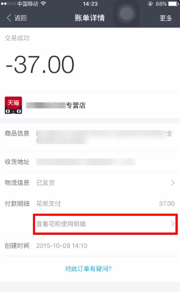 注:使用花呗支付的交易会显示【查看花呗使用明细】,点击跳转到花呗额度明细页面