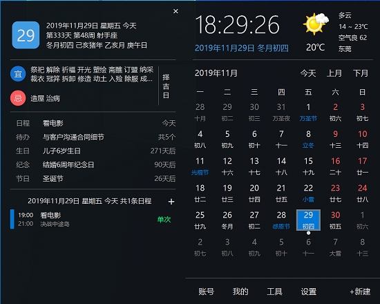 优效日历是非常多的人都在使用人用的一款具有 Win10 风格的桌面日历软件,在 Win10 系统自带的日历之上做出了改良和创新,保留了它界面简洁,显示全面的特点,另外新增了超过 20 余种非常实用功能。