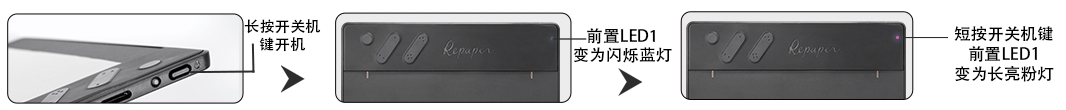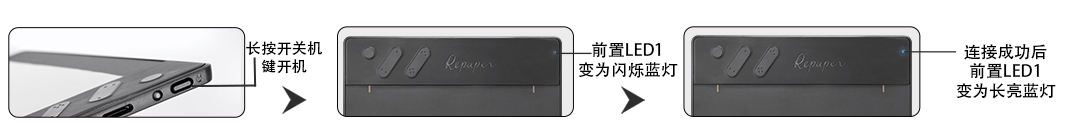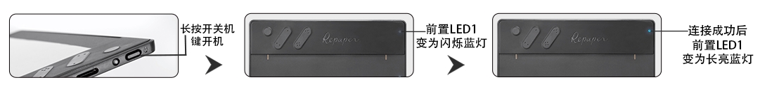 长按数位板侧边开关键开机,前置LED1灯闪烁蓝灯。打开手机/pad的蓝牙,开启软件 Repaper studio,点击软件页面中央连接按钮,连接成功后前置LED1灯由闪烁蓝灯变为长亮蓝灯(手机/ipad是在软件中连接而不是蓝牙界面)。