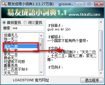 本小词典软件包括词义,拼音,出自以及举例项目 ,易友成语小词典软件为绿色免费软件,主执行exe程序只有70k,共收录1.27万条成语条目