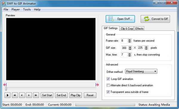 你只需要打开SWF文件(点击“打开SWF”按钮),然后调整输出GIF设置,最后点击“转换为GIF”按钮。这个程序将完成剩下的工作。