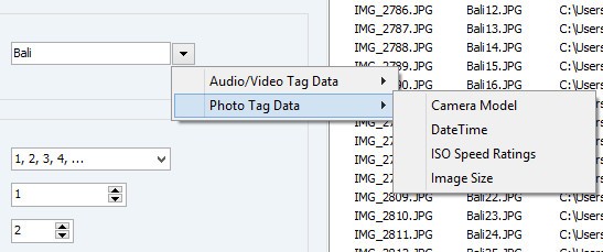 在文件名的某个位置添加文本和数字。可用时,元数据(拍摄日期和时间、相机模式等。)可以自动插入到文件名中。可以使用三种插入模式:正常、覆盖、替换。