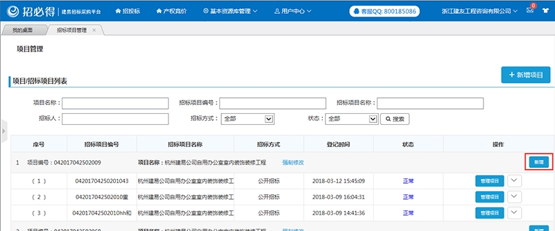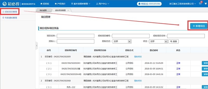 (1)注册成功并登录以后,点击【招标项目管理】——【新增项目】;