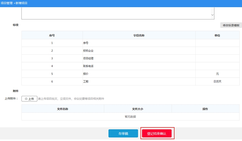 (5)继续录入资质要求等相关信息,如确认无误,请点击【登记结束确认】;