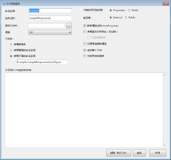 支持以下类型:类型化数组、类型化对象、整数、浮点数、布尔值、字符串和可空类型。可以指定是否生成基于属性或基于字段的POCO类,以及它们的可见性。类名和数组字段会自动复数化/拼音化,可以选择是保留原来的字母大小写还是使用PascalCase。