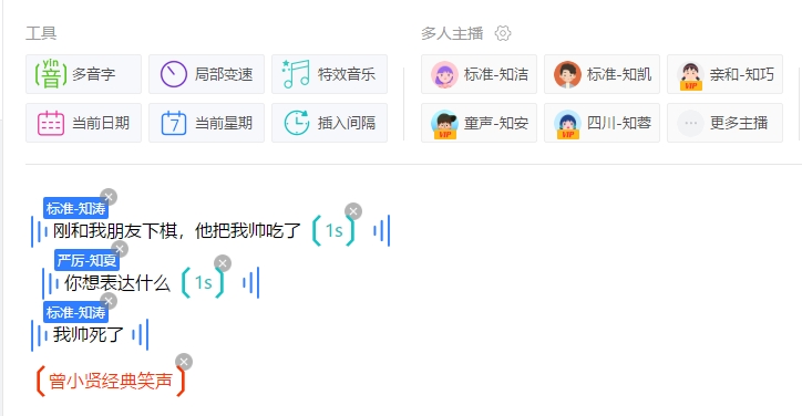 输入对话内容,然后根据不同角色选择不同的主播声音,实现情景对话的效果。例如: