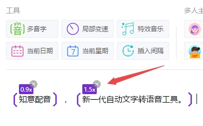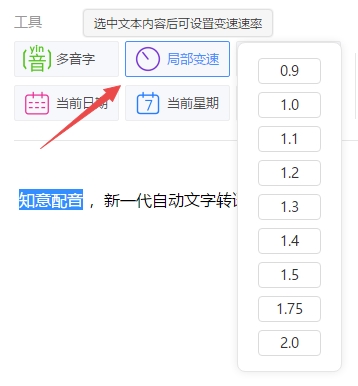 在选中文字以后,点击上方的“局部变速”,会有0.9到2.0的语速选择,一段话中也可以使用不同语速啦。