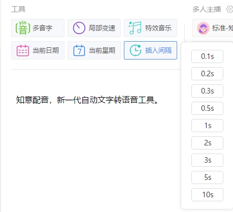 多种间隔选择,从0.1s到10s,一共九种停顿时间,大家可以更快的添加停顿。