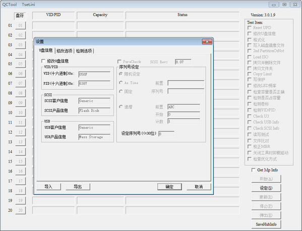 QCTOOL可以批量修改U盘的vid pid,U盘厂家信息,U盘型号信息,usb客户信息,usb产品信息,U盘序列号,这样你的U盘在插上电脑的时候就能自定义显示你的U盘名称了,特别个性。