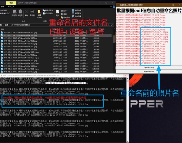 第二:点击开始重命名,然后耐心等待即可,为了省时间,重命名成功的提示没有写出到黑窗口,只输出因拍摄时间同样(即那种1秒拍了十几张照片的,exif中的时间信息一模一样)而导致重命名失败的提示,此时,会自动加上后缀数字1到50,循环50次重命名,当某次重命名成功,会跳出循环,继续下一个照片重命名(之所以循环50次,就是防止有些用户用设备1秒拍出了50张照片)。