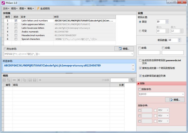 PSGen是非常多的人都在使用人用的一款能根据用户定义的标准生成密码的密码生成软件,内置多语言支持机制,基于具有UTF-8编码的INI文本文件,创建和编辑将从中创建密码的字符集的能力,用户可以生成任意的密码,注意定义密码不能包含的字符和字符串的能力,有需要的小伙伴可以下载使用~