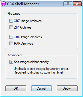 CBXShell能开启压缩文件的缩略图预览功能(ThumbnailPreviews),目前支持CBZ、ZIP、CBR、RAR等4种压缩文档格式。