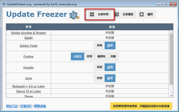 Update Freezer 是非常多的人都在使用人用的一款管理应用软件的自动更新功能的工具,可用于临时一键禁用各类软件的自动更新,能设置自动更新状态为「禁止更新、仅显示更新通知或自动更新」,目前支持的软件包括 Google、Adobe、Java 软件、Firefox、Windows 更新、Skype 等。