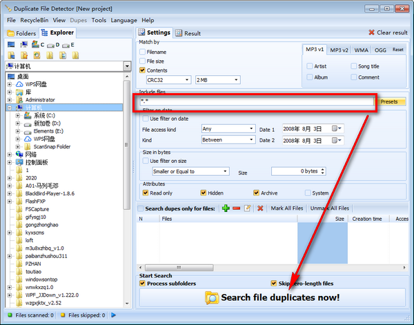 可以根据下列标准搜索重复文件:文件名、文件尺寸或者文件内容。