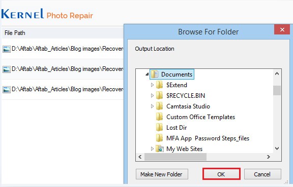 添加任何所需的位置以保存修复的文件,对系统驱动器的位置没有限制,可以创建一个具有保存名称的新文件夹。