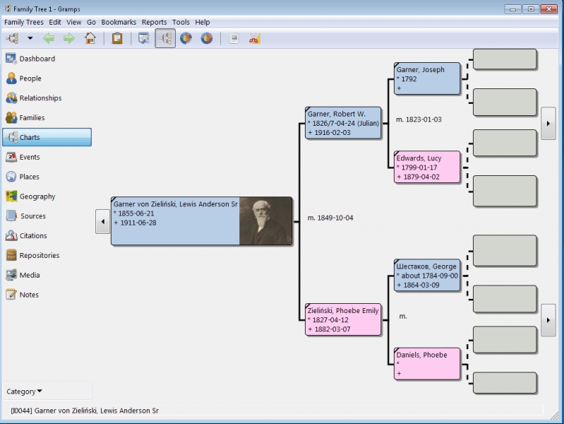 它支持GEDCOM标准,允许进行细粒度的隐私控制,并且可以生成许多不同类型的报告(后代树,图形,连接图等)。