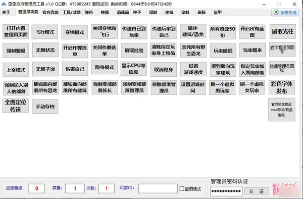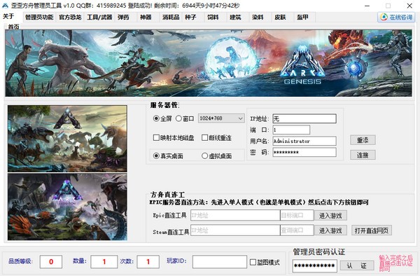 歪歪方舟管理员工具是非常多的人都在使用人用的一款专业非常实用ARK方舟生存进化管理员工具,软件免费,且功能非常强大,支持全平台全模式通用,单机个人服可用,个人服需要知道管理员密码。接下来万能驱动网小编就给大家带来这款软件的具体介绍,感兴趣的小伙伴们速来看看吧~~
