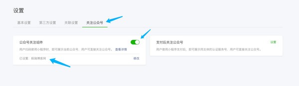 小程序设置关联微信公众号公众号关注组件。当用户扫小程序码打开小程序时,开发者可在小程序内配置公众号关注组件,非常方便用户快捷关注公众号,可嵌套在原生组件内,前往小程序后台,在“设置”->“关注公众号”中设置要展示的公众号。注:设置的公众号需与小程序主体一致