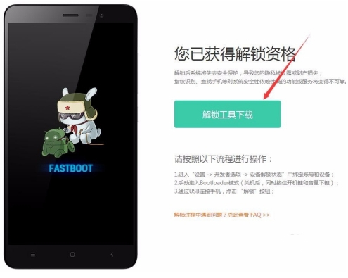 接下来就会显示获得解锁资格页面,点击“解锁工具下载”按钮,把解锁工具下载到本地,然后解压后运行