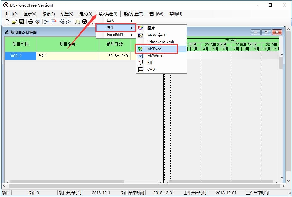 1、当我们在DCProject中设置好计划后,点击顶部菜单栏中的“导入导出”按钮,将鼠标光标悬停在其中的“导出”一栏上,之后在右侧的子菜单中单击选择“MSExcel”选项。