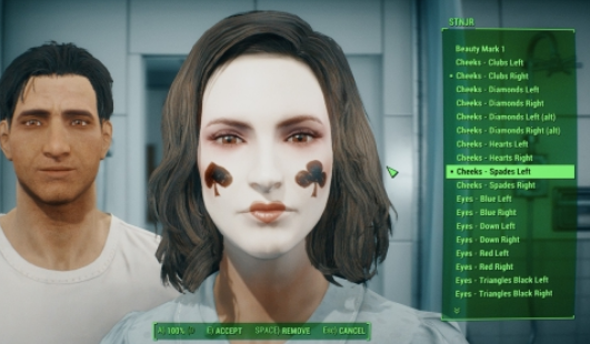 辐射4小丑面部彩绘MOD使用后就会为游戏中的女性角色添加一些独立的面部彩绘,具体效果可以参考下图,有多种款式可以选择,有些是传统的小丑的标志,还有扑克牌的元素,非常有个性,有需要的小伙伴千万不要错过了,赶快来下载使用吧~