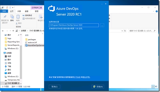 安装软件的过程基本是傻瓜式的,下载镜像文件后,装载ISO文件,允许AzureDevOpsServer2020.exe文件,系统会自动将必要软件安装你的系统中。
