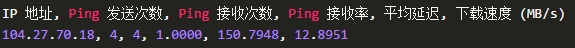 测速完毕后,会把结果保存在当前目录下的result.csv文件中,用记事本打开,排序为延迟由低到高,每一列用逗号分隔,分别是: