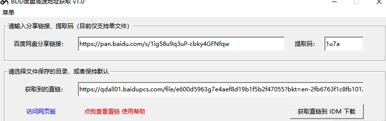 BDD度盘高速地址获取是非常多的人都在使用人用的一款能帮助用户快速获取百度云盘下载的文件的下载直链的软件,利用这款软件能够让用户更好的配合IDM下载器进行文件的高速下载,省去等待的时间,快速下载想要的东西,非常便捷,有需要的小伙伴可以下载使用~
