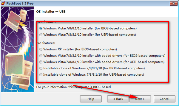 此功能仅在FlashBootPro中可用,但FlashBootFree可以将Windows8/8.1/10的新副本(没有应用程序和设置)安装到USB拇指驱动器或USBHDD。