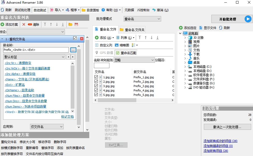 在对文件执行操作之前,您可以验证输出是否正确,如果执行重命名并后悔,则可以撤消整个批处理。