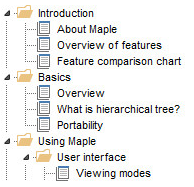 枫树将数据存储在名为节点的单元中,这些节点像树的叶子一样链接在一起,即由分支连接在一起,所有这些都源自同一根。这类似于硬盘上的文件和文件夹。每个节点包含一个文章。文章类似于可以在文字处理器中进行编辑的文档。Maple带有自己强大的内置文字处理器,使您可以直接编辑文章。