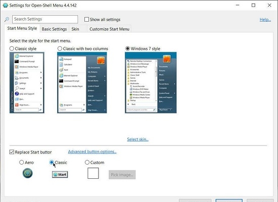 提供多种经典开始菜单样式, 双栏、Windows7样式等不同的风格样式,还可以替换“开始”按钮图案。