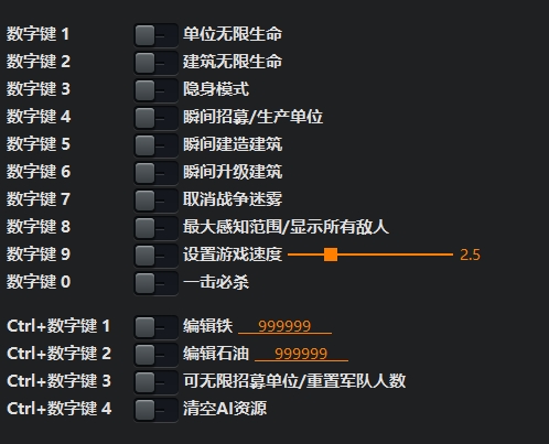 “瞬间招募/生产单位”和“瞬间升级建筑”:需要在招募单位、升级建筑之前激活。生效后在该场战役会一直生效,如果要取消这些功能需要重新加载游戏才会还原效果。