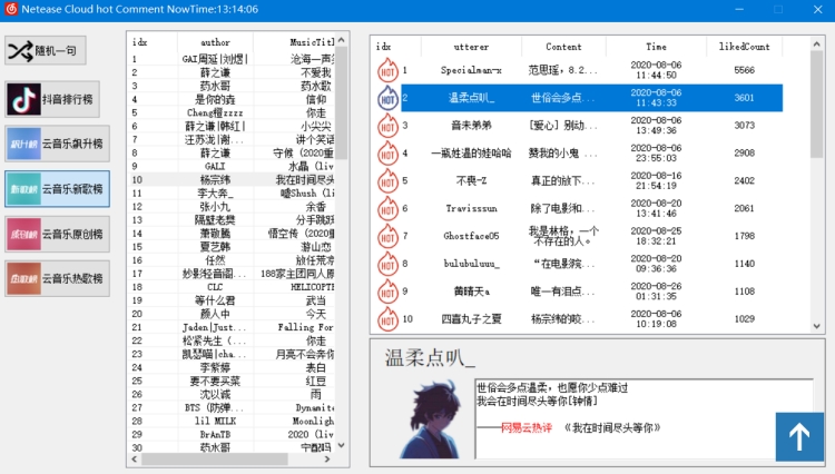 NeteaseCloud云热评可以一键获取网易云排行榜歌曲全部热评,对于网抑云文学感兴趣的用户来说绝对是个福利工具,还支持搜索指定歌曲或专辑查找,,使用方法也非常简单,解压后直接运行NeteaseCloud.exe主程序,进入界面后即可挑选相关平台来获取歌曲热评内容,欢迎下载!