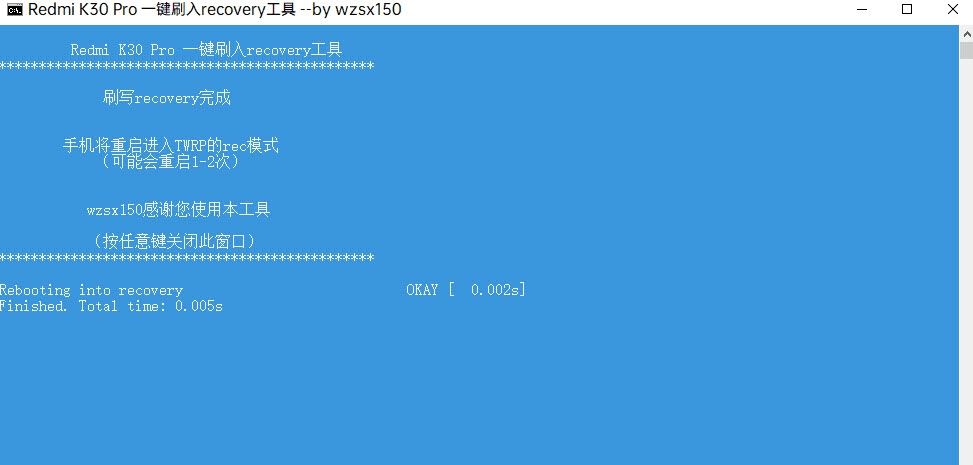 解锁BootLoader后,就算拿到了ROOT的钥匙啦,很简单,直接下载红米K30Pro对应的第三方TWRP_recovery工具,我们这里需要连接电脑,手机关机进兔子模式(音量下和开机按键一起,就进了兔子模式),然后使用一键刷入twrp-recovery工具,基本一键完成刷入刷入完成后,自动进入TWRP_recovery界面。