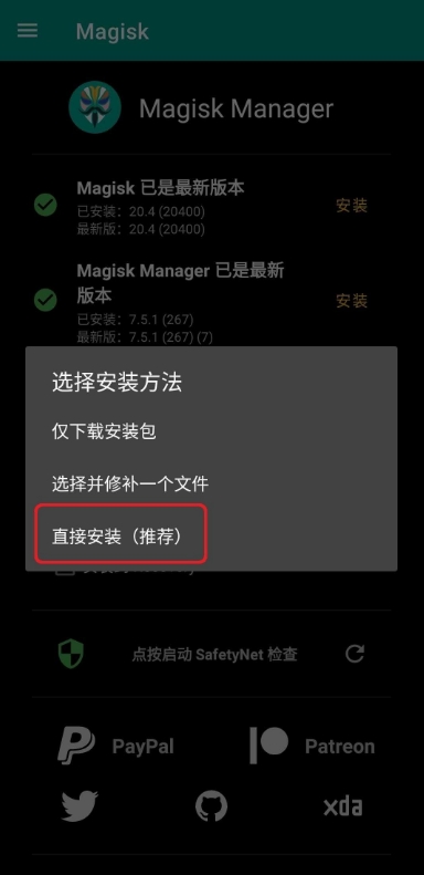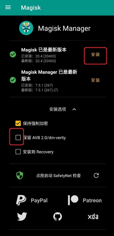 打开面具(需要挂梯)然后取消勾选保留AVB2.0,点安装Magisk-直接安装-点重启即可