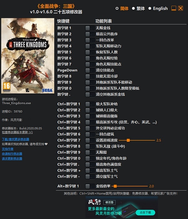 全面战争三国二十五项修改器PC版专门为喜欢全面战争三国的玩家准备了多达二十五项的修改功能,包括无限金钱、最高公共秩序、一回合改革、军队无限移动力、恢复军队人数、角色无限经验、角色无限技能点、技能无需冷却、城镇人口最大、城镇最高储备、最大军队补给等,非常强大,帮助玩家瞬间开挂,快速通关!