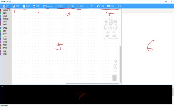 3:设备操作区域 已断开---设备连接或者断开 按键 下载 --下载当前编辑的代码到设备 运行 ---- 运行已下载的程序