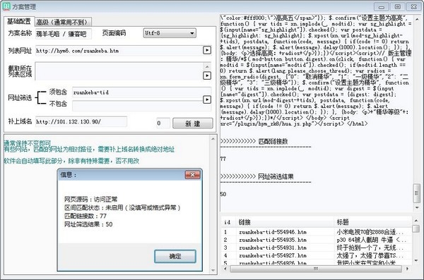如下图,只添加了网站网址以及网址筛选中的须包含词。即告诉软件,包含什么字符串的网址属于文章的网址。其它匹配,都是点测试时,软件自动识别的。