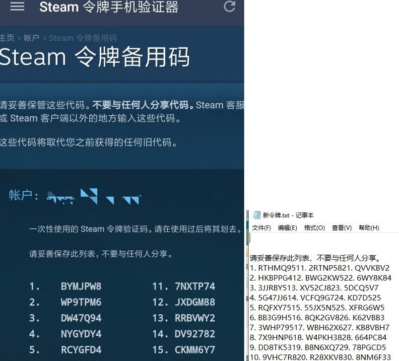 下图是备用码,复制这30个备用码,新建一个txt放进去,保存退出,如下图: