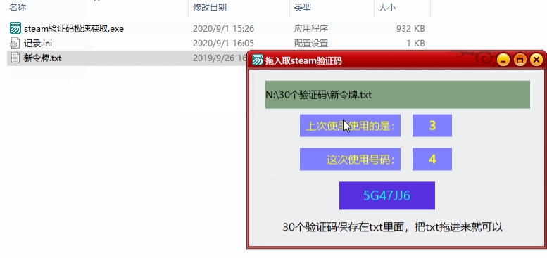 打开软件,把txt直接拖进去,最新、有效的验证码会自动复制到电脑剪切板,你直接打开steam里Ctrl+V粘贴就行,就是这么非常方便。第一次获取的时间,在软件目录下会生成一个“记录.ini”的文档,它是用于记录用到第几个验证码了,这个不用管,30个用完了就把这个“记录ini”删掉就行。